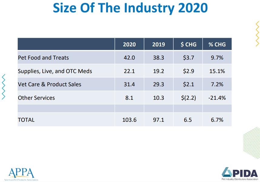 3月24日,美國寵物用品協(xié)會(APPA)發(fā)布報告,美國寵物市場零售額歷史上首次超過1000億美元,達到1036億元的規(guī)模,比2019年的971億美元同比增長6.7%。