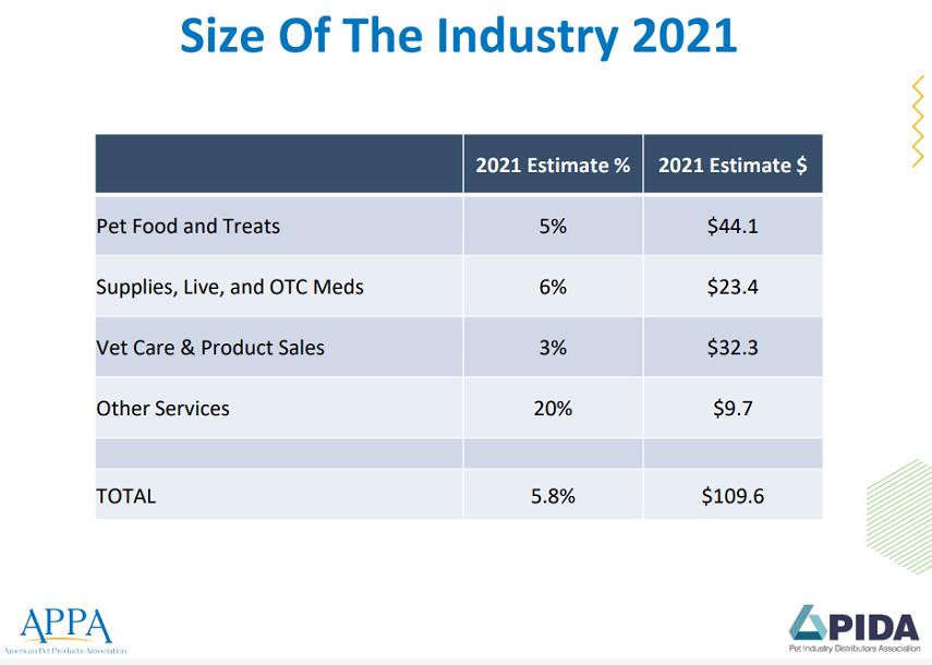 對于2021年的情況,APPA預計,2021年的美國寵物市場的總零售額將達到1096億美元,所有類別的零售都會增加,整個行業(yè)的增長率預計為5.8%。