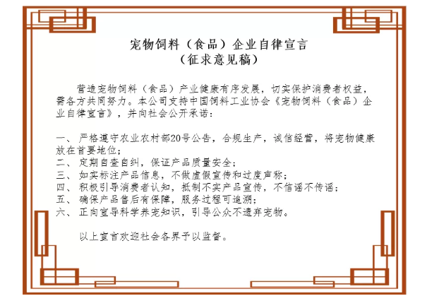 2021年4月27日,由中國飼料工業(yè)協(xié)會主辦、北京市飼料工業(yè)協(xié)會寵物食品與健康分會承辦的“中國寵物飼料(食品)行業(yè)發(fā)展座談會”今日在京召開。大會宣布,中國飼料工業(yè)協(xié)會寵物飼料(食品)分會將開展全國性的寵物飼料(食品)行業(yè)摸底調(diào)研,形成首個《中國寵物飼料(食品)產(chǎn)業(yè)經(jīng)濟發(fā)展報告》,助推寵物飼料產(chǎn)業(yè)發(fā)展。大會還就消費者信任危機、法規(guī)標準完善、企業(yè)自律等議題達成共識,并討論通過了《寵物飼料(食品)企業(yè)自律宣言(征求意見稿)》。