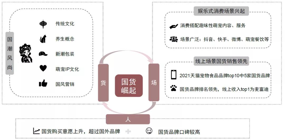 我國寵物行業(yè)正體現(xiàn)出國貨崛起趨勢,國產(chǎn)企業(yè)整體份額上升,且國內(nèi)企業(yè)在行業(yè)頭部占比增加。從人、貨、場三角度,我們也均可看到國貨崛起的新面貌,包括國貨購買意愿及口碑提升、國潮風(fēng)尚興起及國產(chǎn)品牌抓住契機(jī)、寵物國貨娛樂式消費(fèi)火熱。