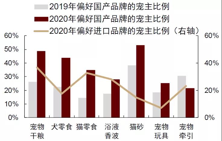 ?從“人”的角度上,國貨購買意愿及口碑提升:從購買意愿上,據(jù)《2020年中國寵物行業(yè)白皮書》數(shù)據(jù),2020年偏好寵物國產(chǎn)品牌的寵物主占比明顯高于偏好進(jìn)口品牌的比例。
