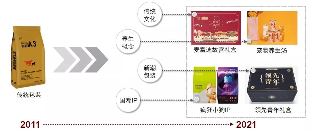 如麥富迪聯(lián)名故宮推出包裝精美、帶有故宮插畫的復(fù)古風(fēng)禮盒,結(jié)合廣告營銷,受到國風(fēng)粉絲追捧;寵督會打造養(yǎng)生概念,設(shè)計配方,推出犬貓高湯罐頭,產(chǎn)品定位獨(dú)具一格;瘋狂小狗打造潮酷IP,伯納天純和中寵設(shè)計漫畫寵物形象,均宣傳國貨的現(xiàn)代感和活力。