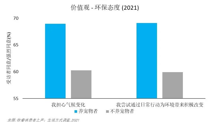 然而與此同時(shí),寵物主人們也越來(lái)越關(guān)注地球的未來(lái),并且正在自己的日常生活中做出可持續(xù)性的改變。歐睿的全球生活方式調(diào)查數(shù)據(jù)顯示,與非寵物主人相比,寵物主人明顯更關(guān)注環(huán)境問(wèn)題,全球近70%的寵物主人表示他們 “擔(dān)心氣候變化”,并“嘗試通過(guò)我的日常行為對(duì)環(huán)境帶來(lái)積極改變”,由此可看出使用可持續(xù)原料寵物食品的潛在增長(zhǎng)空間。