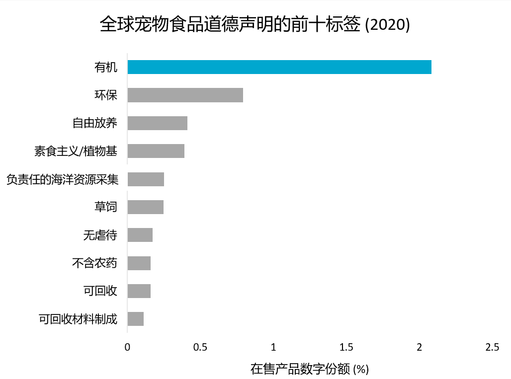 盡管與有機(jī)食品相比,植物基食品所占的份額微不足道,僅占總 SKU 的1%,但考慮到彈性素食主義的火熱,其增長(zhǎng)潛力巨大。盡管全球素食主義者人數(shù)不多,但是大量的消費(fèi)者正嘗試限制其動(dòng)物產(chǎn)品的消費(fèi)(肉的攝入),全球數(shù)量已超20%。此外,寵物主人更有可能選擇素食主義、嚴(yán)格或彈性素食主義的飲食。寵物主的這一趨勢(shì)很有可能會(huì)反映在他們?yōu)閷櫸镞x擇的食品上。
