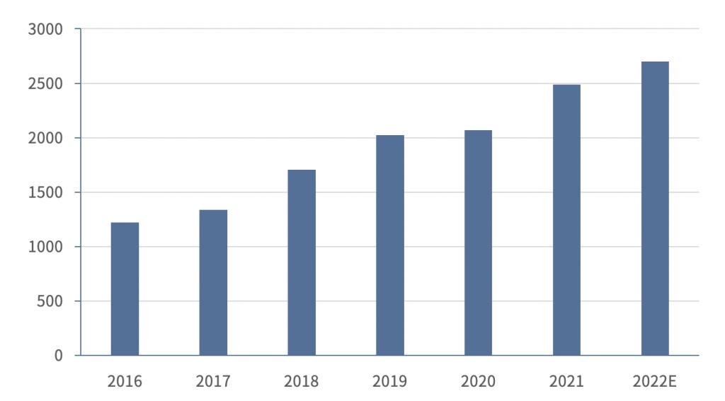 而寵物消費(fèi)市場規(guī)模也隨之增長,2021 年我國寵物消費(fèi)市場規(guī)模已達(dá)到 2490 億元,近五年年復(fù)合增長率在 15% 左右,我們預(yù)計(jì) 2022 年將突破 2700 億元。