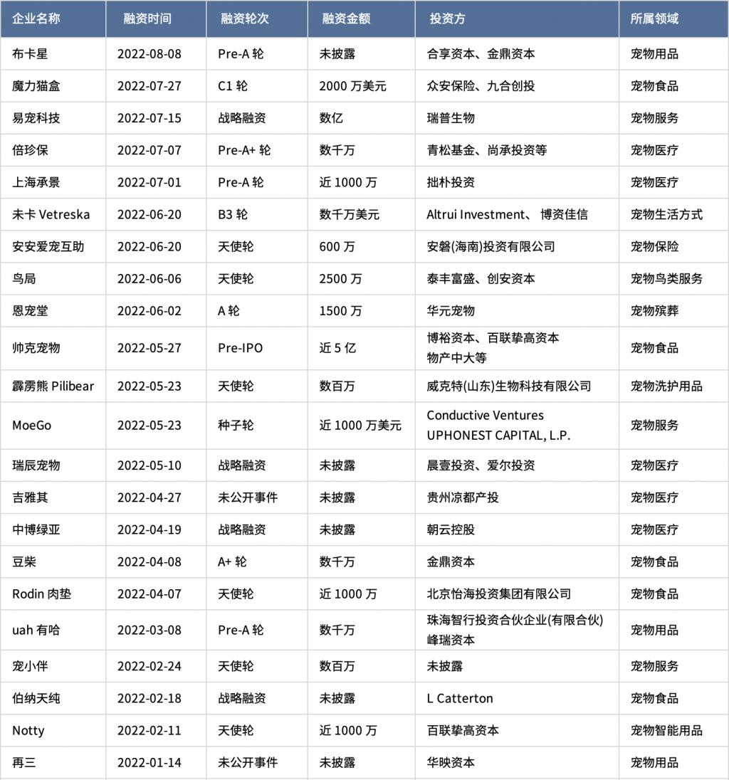 從國內(nèi)寵物賽道細(xì)分投資領(lǐng)域來看,寵物食品、寵物用品和寵物醫(yī)療依舊是資本最為關(guān)注的領(lǐng)域,三者今年各自都有 5 起融資事件,其次是寵物服務(wù)領(lǐng)域有 4 起,另外一些 " 小而精 " 的細(xì)分領(lǐng)域,如寵物殯葬、寵物保險(xiǎn)、寵物鳥類服務(wù)線下門店等也都有獲得了相應(yīng)投資。