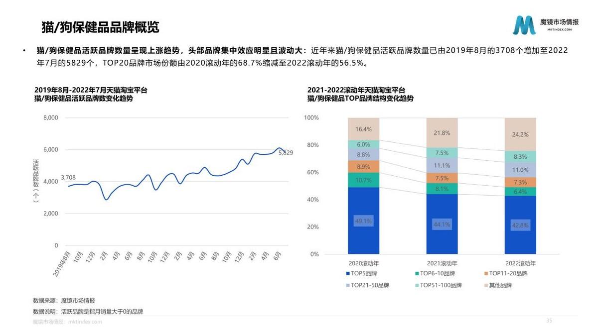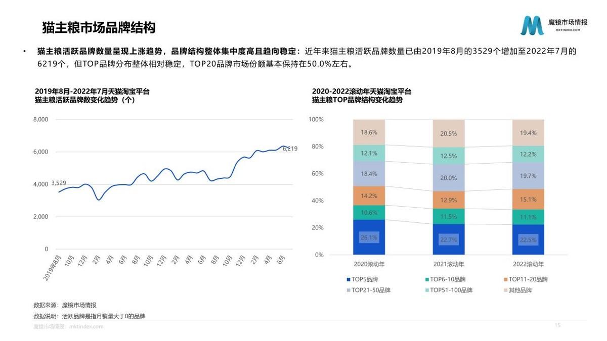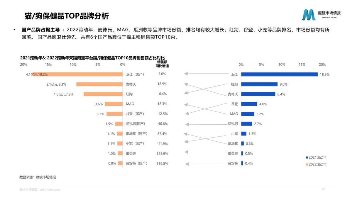 2022滾動年天貓?zhí)詫殞櫸锪闶充N售額達52.8億元,同比增速為14.2%,市場增速略低于寵物食品整體。但占比為71.5%的貓零食市場,增速達22.4%,明顯高于狗零食、鼠類等小寵物零食、兔類零食。2022滾動年希寶、瓜洲牧、阿飛和巴弟等品牌市場份額、排名均有較大增長;國產(chǎn)品牌麥富迪處于領先地位,共有6個國產(chǎn)品牌位于貓主糧銷售額TOP10內(nèi)。