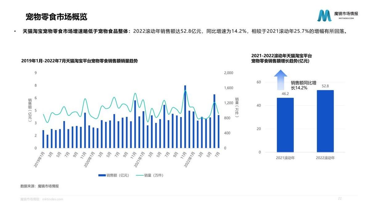 線上渠道成為寵物食品消費的重要方式,線上寵物食品銷售額占比由2010年的1.2%增長至2018年的45.4%。2022滾動年天貓?zhí)詫殞櫸锸称蜂N售額達247.6億元,同比增速為14.5%。寵物主糧作為寵物食品市場TOP1品類,呈波動上升趨勢,寵物零食和寵物營養(yǎng)保健食品市場繼續(xù)穩(wěn)步增長。