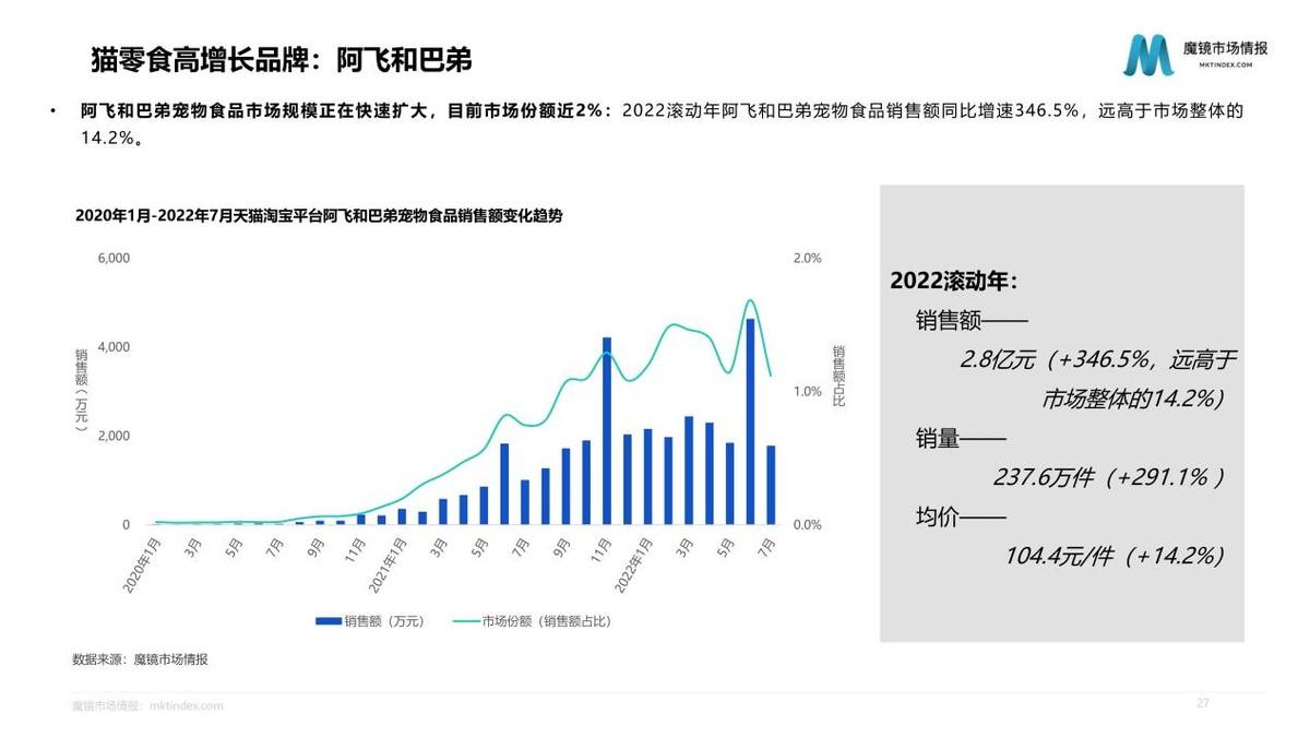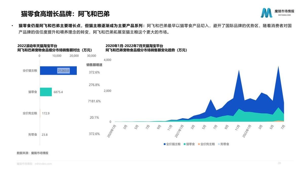 2022滾動年阿飛和巴弟寵物食品,銷售額同比增速346.5%,遠高于市場整體的14.2%。貓零食仍是阿飛和巴弟主要增長點,但貓主糧銷售額貢獻度逐漸反超。阿飛和巴弟最早以貓零食產(chǎn)品切入,避開了國際品牌的優(yōu)勢區(qū)域,隨著消費者對國產(chǎn)品牌的信任度提升,和喂養(yǎng)理念的轉(zhuǎn)變,阿飛和巴弟拓展至貓主糧這一更大的市場。