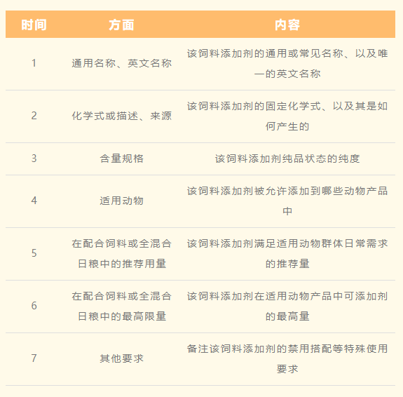 《飼料添加劑安全使用規(guī)范》中從通用名稱、英文名稱、化學(xué)式或描述、來源、含量規(guī)格、適用動物、在配合飼料或全混合日糧中的推薦用量、在配合飼料或全混合日糧中的最高限量以及其他要求這幾個方面對每一個在列的飼料添加劑進行了詳細規(guī)定介紹。
