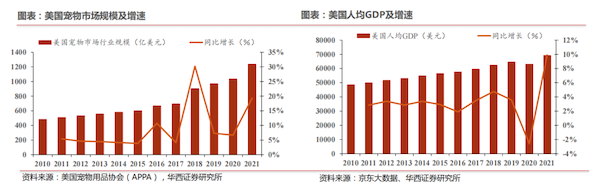 美國人均GDP增長驅(qū)動寵物市場規(guī)模增長,其經(jīng)濟快速發(fā)展帶來寵物平均消費增長和養(yǎng)寵人群增加。
