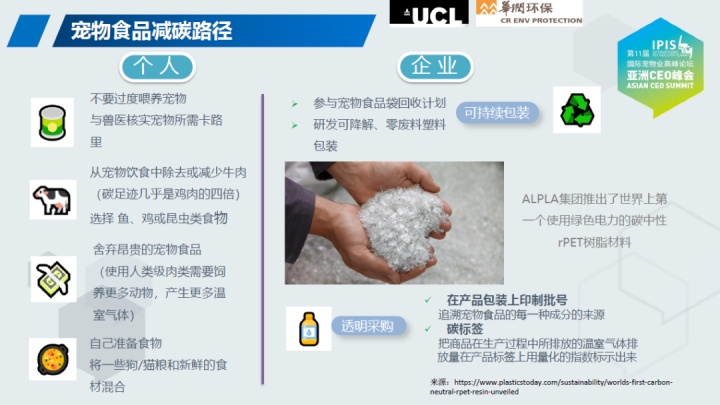 過去很多學者對寵物行業(yè)碳排放進行過分析,以肉為主要食物的貓狗每年會產(chǎn)生6400萬噸的排放量,相當于1360萬輛汽車的排放。2020年愛丁堡大學研究顯示,寵物食品行業(yè)每年會產(chǎn)生5600萬-1.51億噸二氧化碳當量排放,占全球農(nóng)業(yè)排放的1.1%-2.9%,相當于全球航班碳排放總量的1/6。如何減排?個人要做的是不要過度喂養(yǎng)寵物,不要浪費食物,在寵物飲食中嘗試減少牛肉的選擇,因為碳排放的持續(xù)上升,進店點一份牛排就要交好幾十塊的稅。盡量避免使用比較昂貴或者是生產(chǎn)流程比較長的寵物食品,或考慮自己準備一些食物。企業(yè)方面可以更好地做包裝回收,使用可持續(xù)包裝,使用更負責任的采購流程。使用綠色電力,在包裝材料上使用可降解的生物材料,這能夠?qū)档吞寂欧庞蟹浅4蟮膸椭?,比如使用PHA材料能很好地緩解對環(huán)境的影響并降低碳排放。在設(shè)計的過程中使用環(huán)保材料,減少玩具的購買或者是購買可持續(xù)材料生產(chǎn)的玩具,生產(chǎn)綠色便袋,使用100%可降解的材料都可以在實際過程中降低碳排放。對大型的寵物企業(yè)來講如果能夠建立碳排放核算和報告管理體系,對企業(yè)未來核算碳排放價格將會起到重要的作用。除此之外,太陽能光伏和寵物糞便的回收再利用,塑料的可降解材料,這一系列的場景都能夠開發(fā)成碳排放的資產(chǎn),每年可以為企業(yè)取得50-200萬的收入。