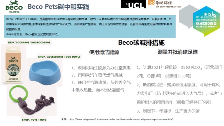 其中包括制定環(huán)境挑戰(zhàn)的統(tǒng)籌方案,使用國際公認的PAS2060碳中和標準,采用可再生電力,采購可持續(xù)原料、減少廢棄料產(chǎn)出促進循環(huán)以及氣候智能型業(yè)務(wù)轉(zhuǎn)型。在寵物營養(yǎng)需求方面提供更專業(yè)和精確的配方進行成分優(yōu)化,降低高碳足跡的成分開發(fā)并使用低碳可替代的成分。英國企業(yè)BecoPets,在寵物食品、玩具的碳減排方面都開展了很多工作,比如在辦公室使用清潔能源供電,全面使用電動汽車,使用空氣源熱泵來吸收空氣中的熱量等等,同時也在計算2021年的碳足跡并研究如何低效碳排放的舉措。