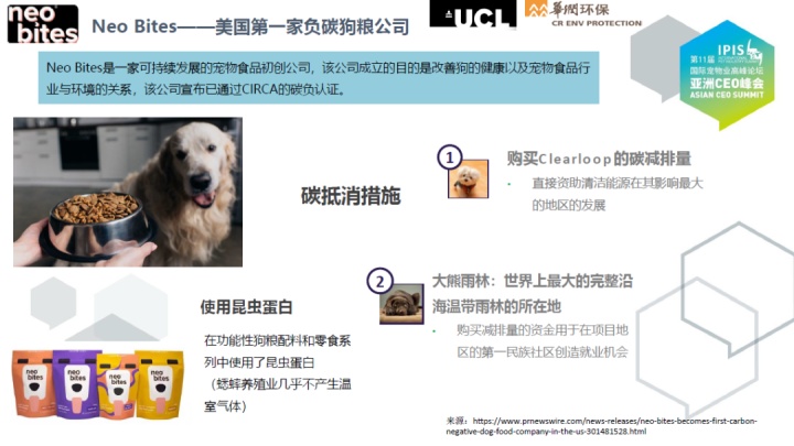 目前國際上有許多的寵物公司,特別是新興起的公司開展不同方法來降低排放。比如NeoBites,美國第一家負碳排放的寵糧公司,在碳減排的行動上,一方面在寵糧中使用昆蟲蛋白,因為昆蟲蛋白相比其他肉類的碳足跡比較低;另一方面是通過購買Clearloop的碳減排量來實現(xiàn)整個公司的碳中和并實現(xiàn)負碳排放。