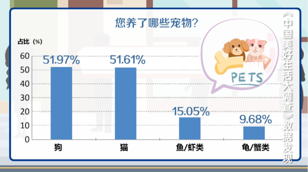 《中國(guó)美好生活大調(diào)查》在網(wǎng)絡(luò)上進(jìn)行了更詳細(xì)的調(diào)查發(fā)現(xiàn),養(yǎng)貓和養(yǎng)狗的人幾乎是平分秋色,不相上下。養(yǎng)魚蝦類和龜蟹類的人分別以15.05%和9.68%的比例列三、四位。不論養(yǎng)什么,不管它們?cè)趺搭B皮,都是自己心中的寶貝。