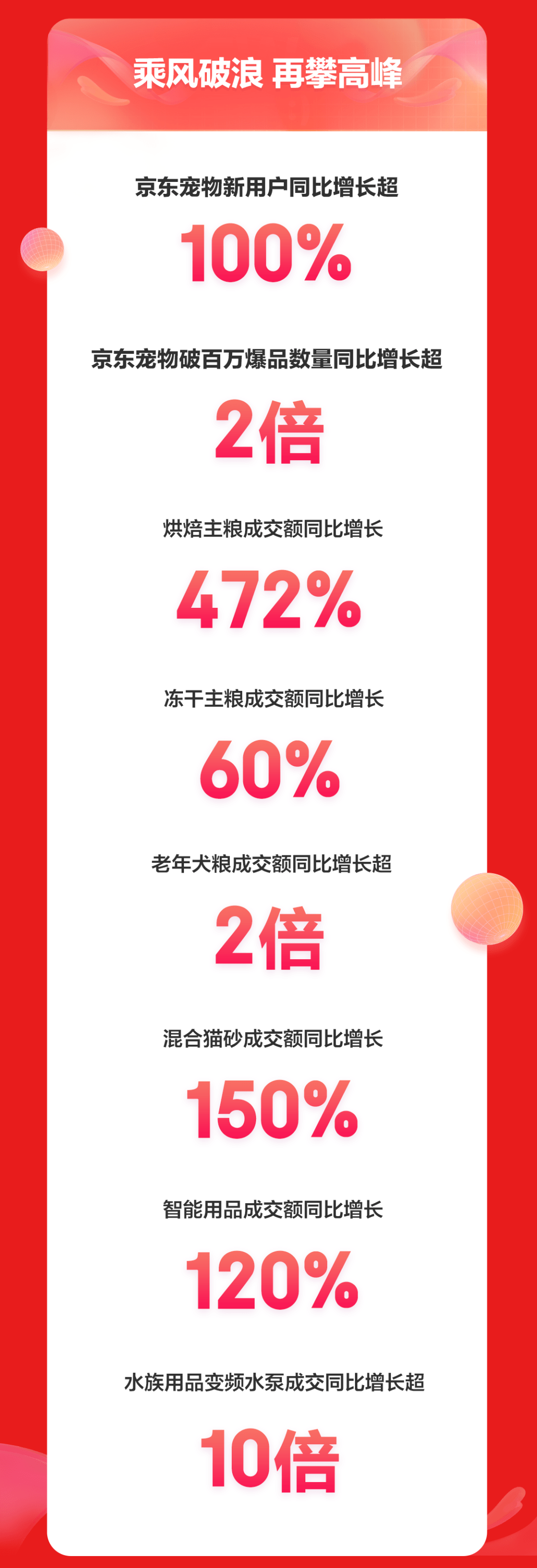 據(jù)戰(zhàn)報(bào)顯示,6月17-18日京東寵物新用戶同比增長(zhǎng)超100%,京東寵物破百萬(wàn)爆品數(shù)量同比增長(zhǎng)超2倍,京東寵物直播間單場(chǎng)成交額同比增長(zhǎng)超125%,圍觀人次超百萬(wàn)。
