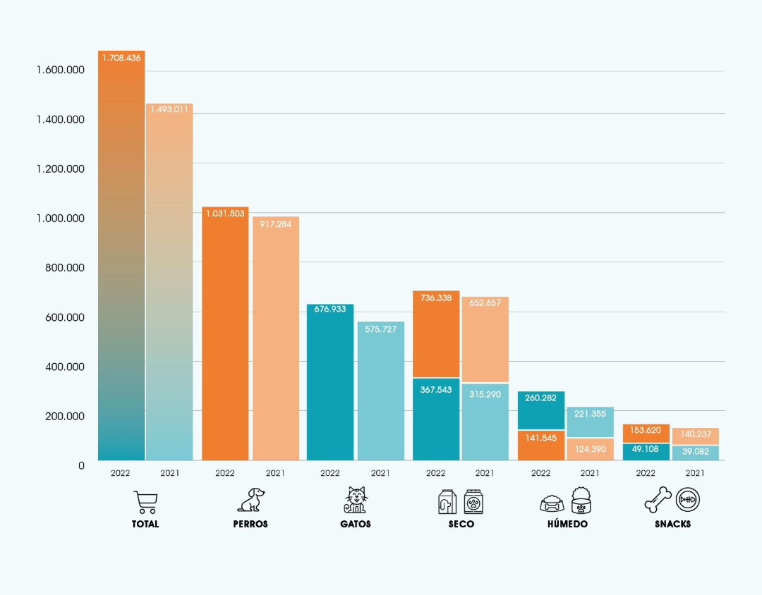 根據(jù)西班牙伴侶動物食品制造商協(xié)會(ANFAAC)的數(shù)據(jù),2022年西班牙寵物食品行業(yè)將達到17.08億歐元,與2021年14.93億歐元相比增長了14.4%。