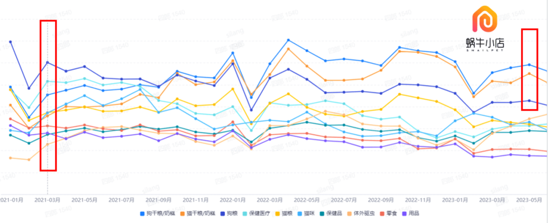 從圖表中可以看到,從2021年3月到2023年5月,線下渠道出現(xiàn)一個明顯的兩極分化現(xiàn)象,犬貓糧等寵物食品的銷量依舊很好,但寵物用品的銷量相比疲軟,比往年還要低一些。