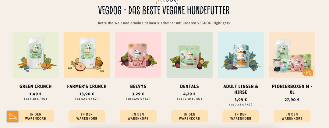 植物基已經(jīng)成為食品領(lǐng)域的全球發(fā)展趨勢之一,而有一些寵物消費者也想讓自己的寵物吃到自己認為最好的食材,所以寵物界對相關(guān)產(chǎn)品的需求也日益增長。以vegdog為例,vegdog是一家德國初創(chuàng)企業(yè),成立于2016年,定位為純素食、無麩質(zhì)全價狗狗濕糧,產(chǎn)品特點是原料中不含動物蛋白和麩質(zhì)等過敏原,并包含狗狗必備的營養(yǎng)素。