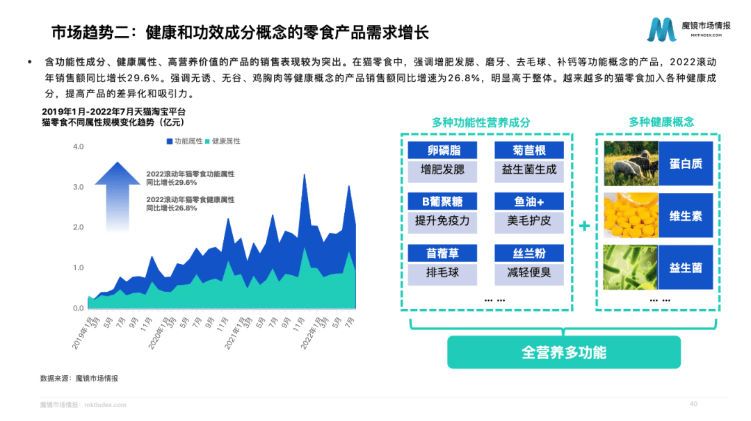 魔鏡通過分析國內(nèi)電商平臺(天貓?zhí)詫?京東)的寵物市場數(shù)據(jù),洞察到國內(nèi)寵物食品賽道的2個大趨勢: