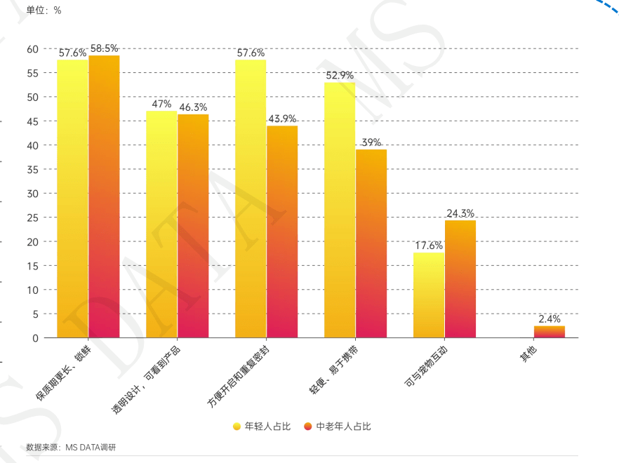 從細(xì)分人群來看,保質(zhì)期更長和鎖鮮的包裝設(shè)計(jì)更迎合年輕和中老年養(yǎng)寵人群的需求,另外年輕養(yǎng)寵人群還更注重方便開啟和重復(fù)密封的產(chǎn)品包裝設(shè)計(jì)。