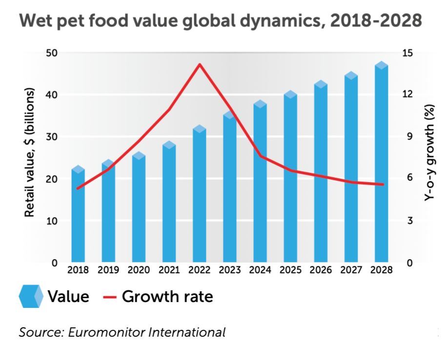 如今,寵物濕糧的需求持續(xù)增長(zhǎng),盡管增長(zhǎng)速度緩慢。除了價(jià)值因持續(xù)的高通脹而增長(zhǎng)外,預(yù)計(jì)2023年的銷量將增長(zhǎng)1.4%。高成本意味著購(gòu)買模式正在發(fā)生變化,生產(chǎn)商正在尋求更多的利潤(rùn)空間。