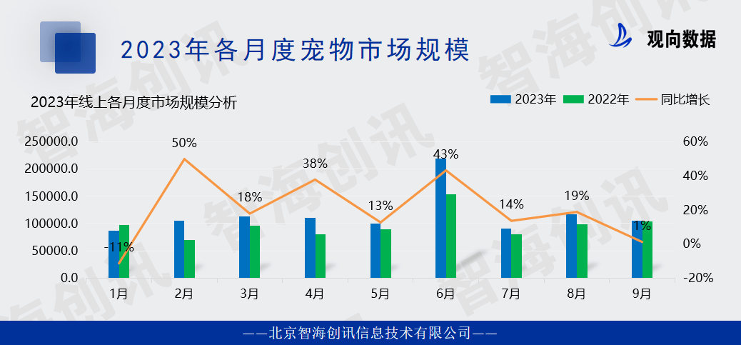 據(jù)數(shù)據(jù)顯示,2023年1~9月,某一線上平臺(tái)的寵物市場(chǎng)規(guī)模已經(jīng)達(dá)到105億元,同比增長(zhǎng)20.6%。其中,6月份的銷(xiāo)量最高,同比增長(zhǎng)43%。