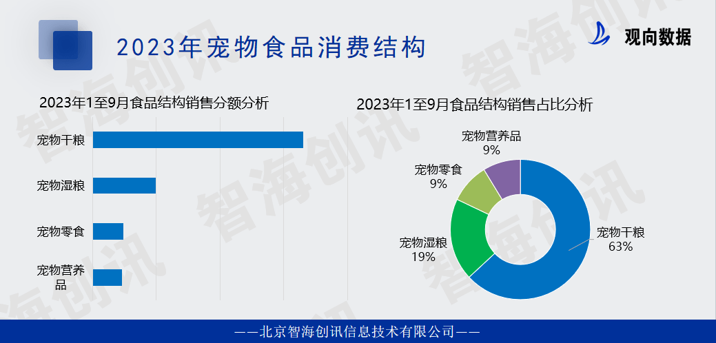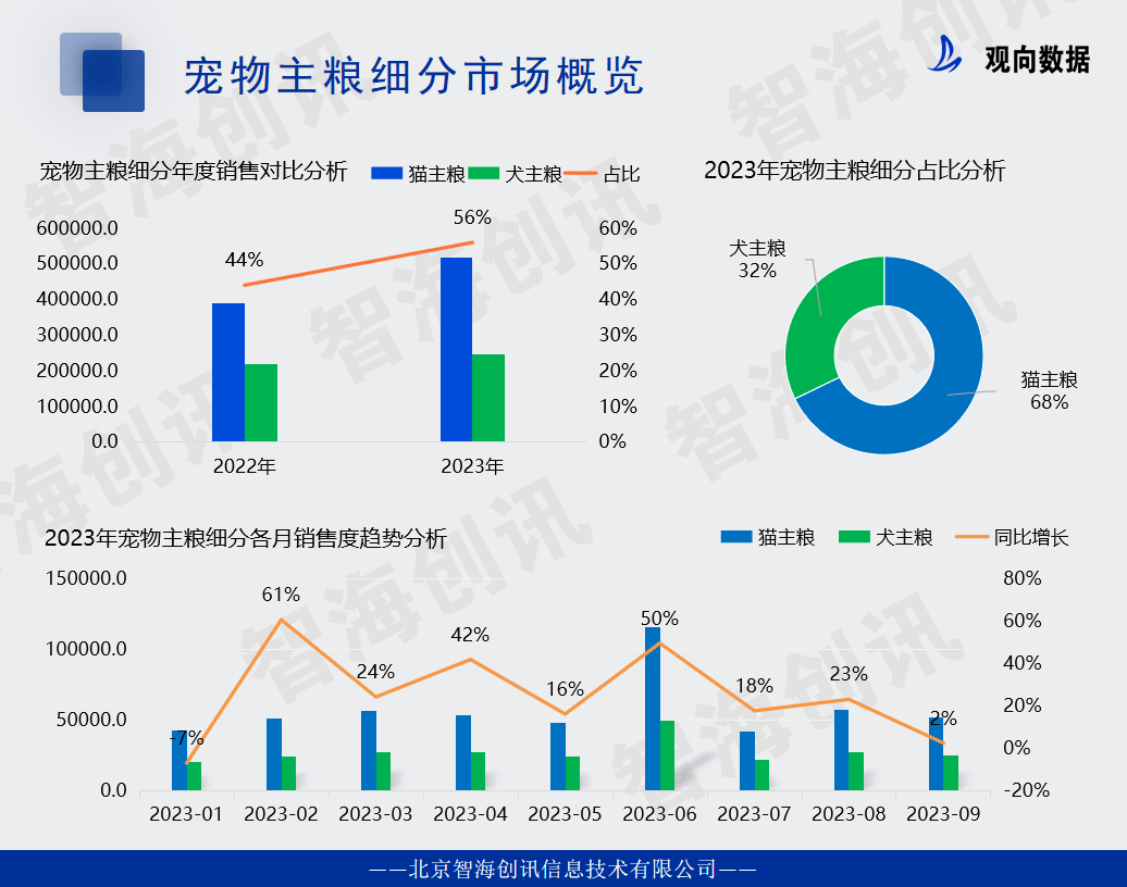 寵物主糧(包括干糧和濕糧),干糧市場(chǎng)高于濕糧市場(chǎng)銷(xiāo)售,2023年干糧市場(chǎng)銷(xiāo)售占比為77%,濕糧銷(xiāo)售占比為23%。比數(shù)據(jù)來(lái)看,寵物主糧市場(chǎng)銷(xiāo)售以寵物干糧為主。