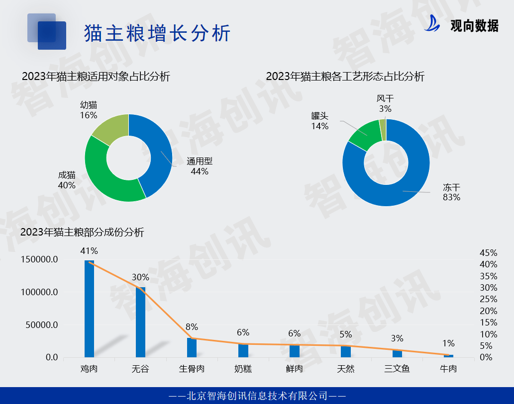 寵物貓由于生活在人類(lèi)的環(huán)境中,沒(méi)有辦法自主覓食,因此人類(lèi)給其提供的食物性產(chǎn)品都可以稱(chēng)之為貓糧。隨著情細(xì)化和科學(xué)化喂養(yǎng)理念的增強(qiáng),健康化、專(zhuān)業(yè)化、均街營(yíng)養(yǎng)化成為寵物貓主糧的主流。從適用對(duì)象來(lái)看,大部分貓主糧為通用型占比44%,成貓主糧占40%,小部分幼貓主糧占16%。從貓主糧工藝形態(tài)來(lái)看,凍干工藝占據(jù)主流,占比為86%。從成分上來(lái)看主要包括,雞肉、無(wú)谷、生骨肉、奶糕、鮮肉等。