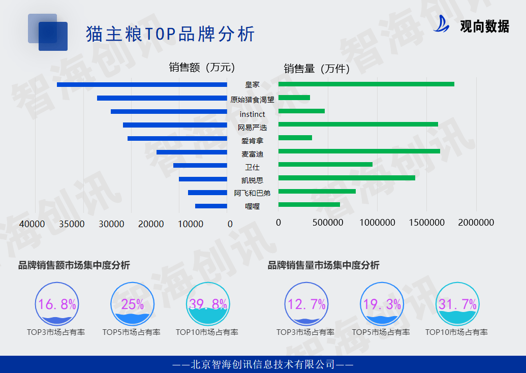 根據(jù)統(tǒng)計(jì)數(shù)據(jù)顯示,貓主糧市場(chǎng)的品牌銷(xiāo)售情況呈現(xiàn)出一種相對(duì)均衡的趨勢(shì)。其中,皇家、原始消食渴望和instinct是市場(chǎng)份額排名前三的品牌,它們共占據(jù)了16.8%的市場(chǎng)份額。而在前五名品牌中,市場(chǎng)份額則達(dá)到了25%,而前十名品牌的市場(chǎng)份額更是達(dá)到39.5%。從這些數(shù)據(jù)來(lái)看,貓主糧市場(chǎng)的競(jìng)爭(zhēng)程度相對(duì)較低,新品牌進(jìn)入市場(chǎng)的門(mén)檻相對(duì)較低,這也為市場(chǎng)格局的多元化創(chuàng)造了條件。