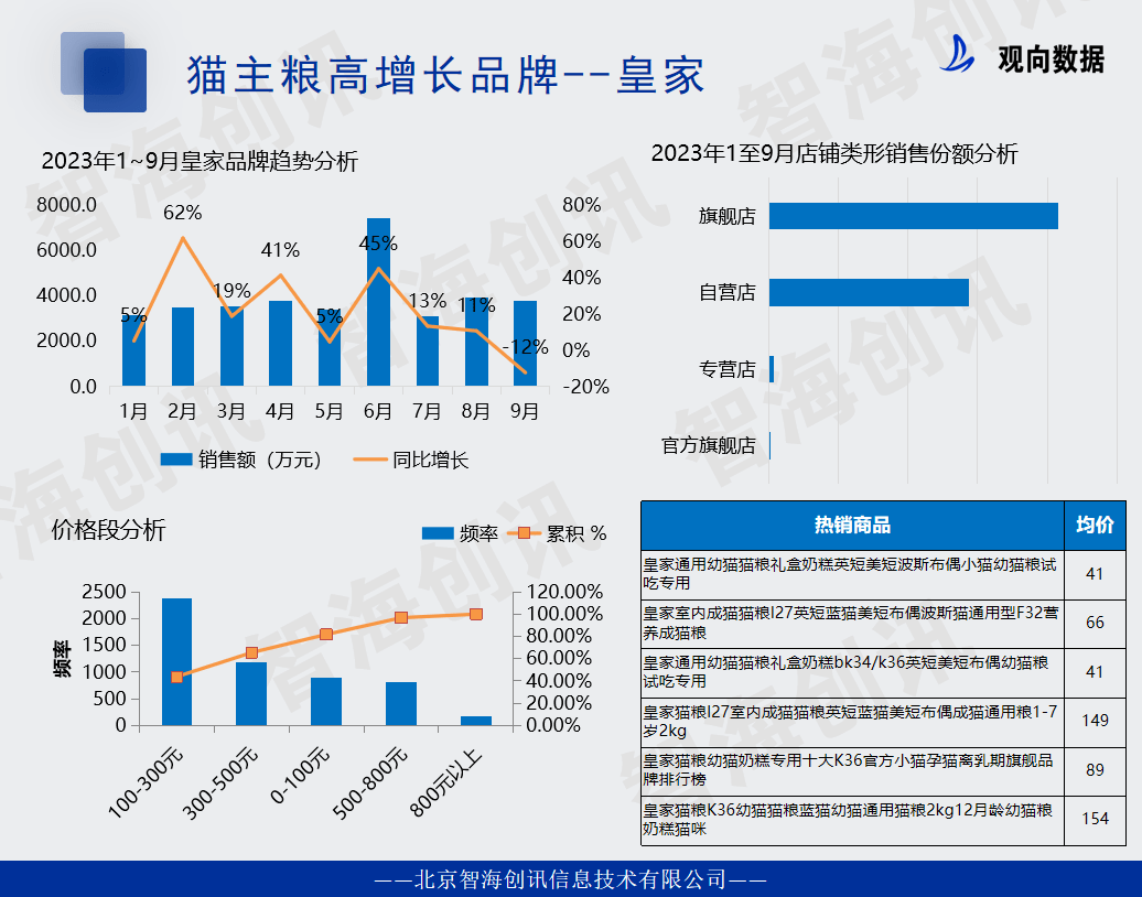 根據(jù)數(shù)據(jù)顯示,皇家品牌2023年1~9月銷(xiāo)售主要集中在6月,同比去年增長(zhǎng)52%。從店鋪類(lèi)型來(lái)看,銷(xiāo)售主要集中在旗艦店占比51%;從價(jià)格段來(lái)看銷(xiāo)售主要集中在0-100元之間。