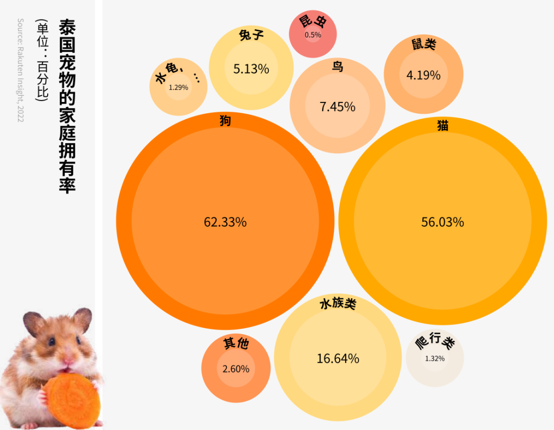 泰國寵物主要以犬貓為主,寵物狗是泰國家庭普遍飼養(yǎng)的寵物,其家庭擁有率在62.33%,寵物貓擁有率為56.03%。除了犬貓以外,水族類、鳥類以及兔類鼠類都在泰國有著不低的擁有率,其中水族類比例是16.64%、鳥類為7.45%。