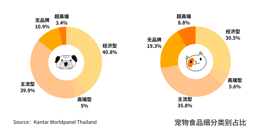 對于犬主來說,經(jīng)濟型犬糧占據(jù)了泰國犬主糧的40.8%、主流型占39.9%、其他還有無品牌貓糧(10.9%)、高端型(5%)和超高端型(3.4%)。