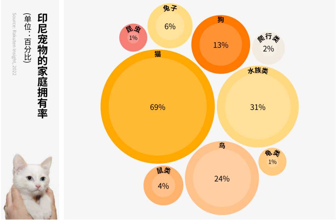 在寵物家庭擁有率上,寵物貓在印尼的家庭擁有率上占據(jù)絕對地位,占比69%,其次是水族類占比31%、鳥類占比24%,而寵物狗僅占比13%。