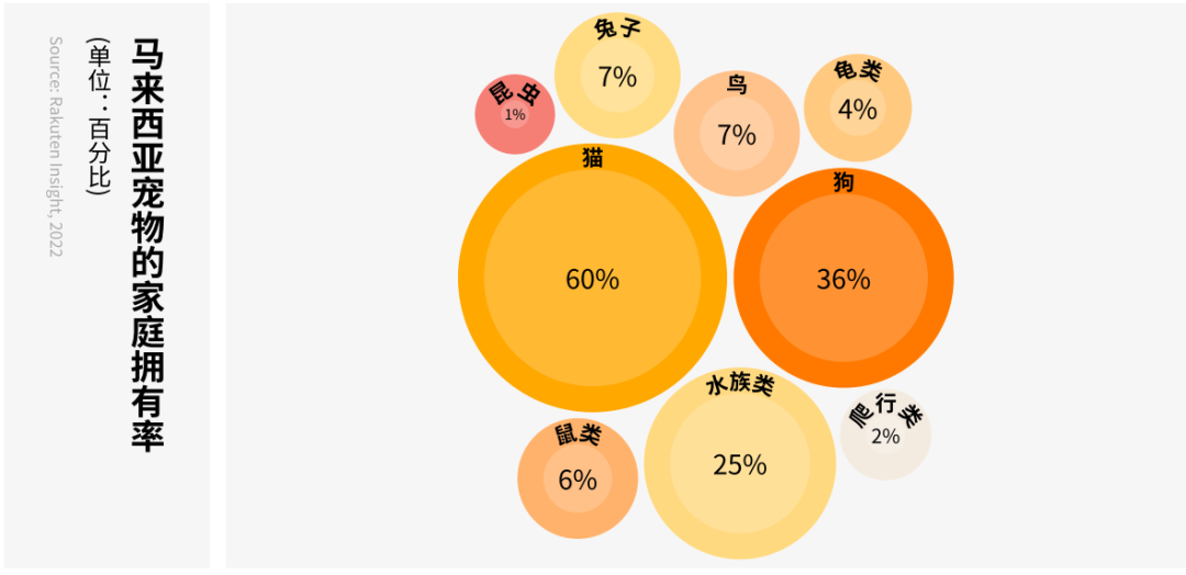 在寵物家庭擁有率上,貓和狗在當?shù)仞B(yǎng)寵占比最大,分別為60%和36%。其次是水族類(25%)、兔子(7%)和鳥類(7%)。