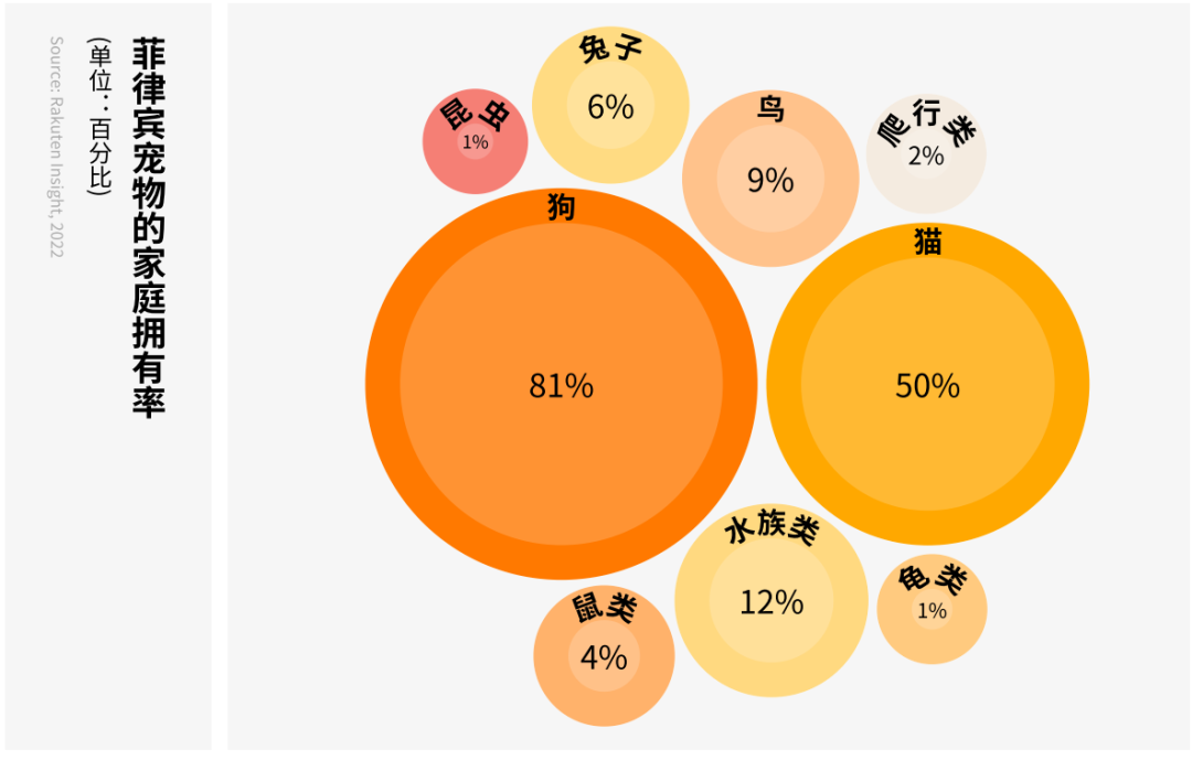 從消費品類看,因狗最受歡迎,菲律賓寵物市場全類相關的產(chǎn)品和服務消費占比較高。不過,隨著貓擁有率的增長,與之相關的產(chǎn)品和服務近年也呈現(xiàn)增長趨勢。
