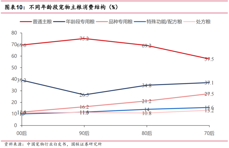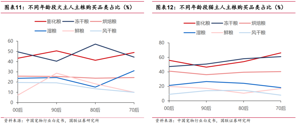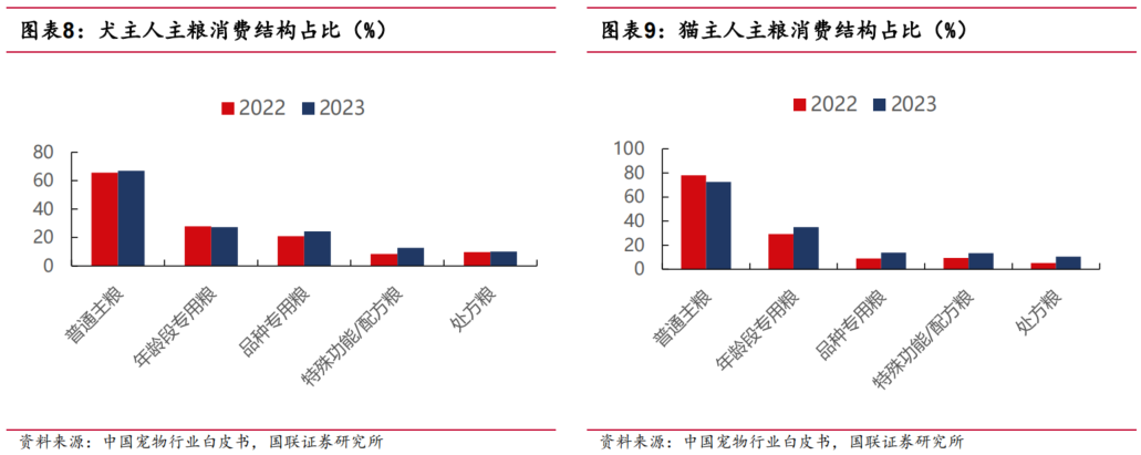 在品種專用糧市場,2023年犬主人消費(fèi)占比為24.4%,貓主人消費(fèi)占比為13.8%,犬主人消費(fèi)意愿更強(qiáng)。90后等主要年輕寵主以普通主糧消費(fèi)為主,00后寵主年齡段專用糧消費(fèi)顯著增加,普通主糧品類或為寵物食品市場主要競爭點。