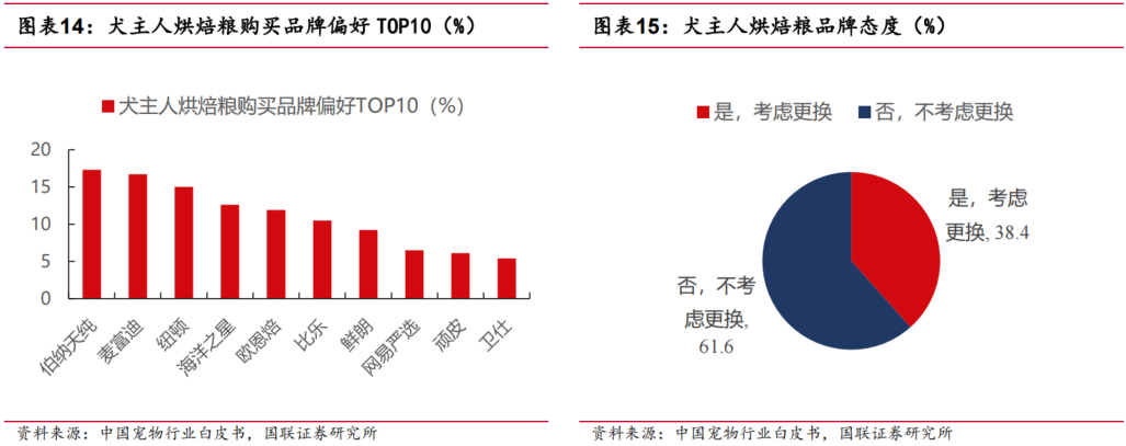 新品類烘焙糧逐步擠壓傳統(tǒng)品類烘焙糧市場空間,國產(chǎn)品牌在此細(xì)分賽道積極布局進(jìn)一步搶占市場,犬主人烘焙糧偏好前三的品牌分別為伯納天純、麥富迪、紐頓。