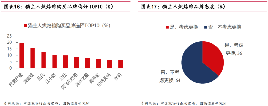 貓主人烘焙糧偏好前三的品牌分別為網(wǎng)易嚴(yán)選、麥富迪、藍(lán)氏,其中麥富迪、網(wǎng)易嚴(yán)選為自主國產(chǎn)品牌,伯納天純、藍(lán)氏為國際品牌國內(nèi)生產(chǎn),紐頓為國際進(jìn)口品牌。