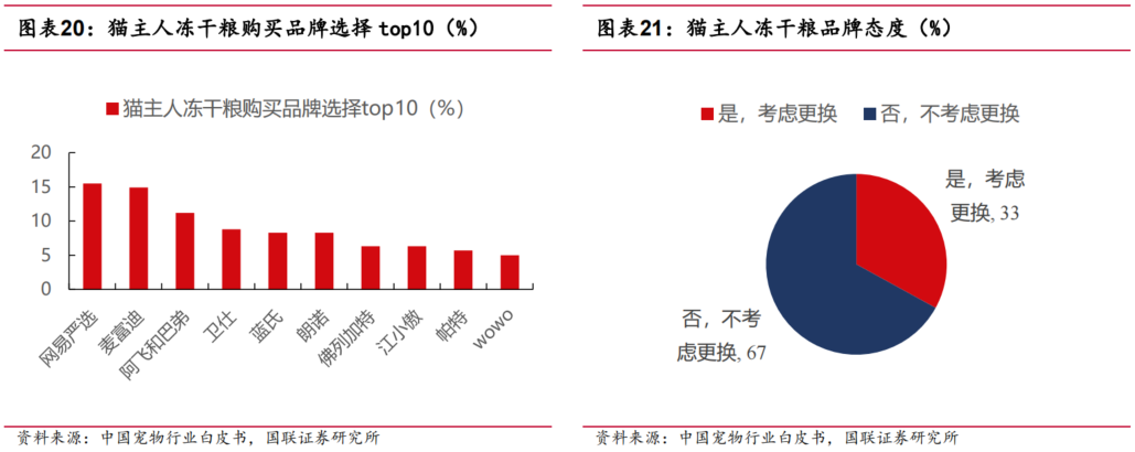 犬主人凍干糧偏好前三的品牌分別為麥富迪、伯納天純、瘋狂小狗,貓主人凍干糧偏好前三的品牌分別為網(wǎng)易嚴(yán)選、麥富迪、阿飛和巴弟,除伯納天純?yōu)閲H品牌國內(nèi)生產(chǎn)外,其余品牌均為國內(nèi)自主生產(chǎn)品牌,凍干糧領(lǐng)域國產(chǎn)品牌受歡迎程度進(jìn)一步提升。