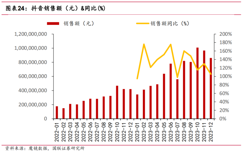12月天貓?zhí)詫殞櫸锲奉愪N售額為44.75億元,同比減少10.76%。拆分量價看,銷量同比增加8.67%,客單價同比減少17.88%;京東寵物品類銷售額為9.43億元,同比減少3.91%。拆分量價看,銷量同比增加7.04%,客單價同比減少10.22%;抖音寵物品類銷售額為8.61億元,同比增加105.26%。拆分量價看,銷量同比增加132.42%,客單價同比減少11.68%。