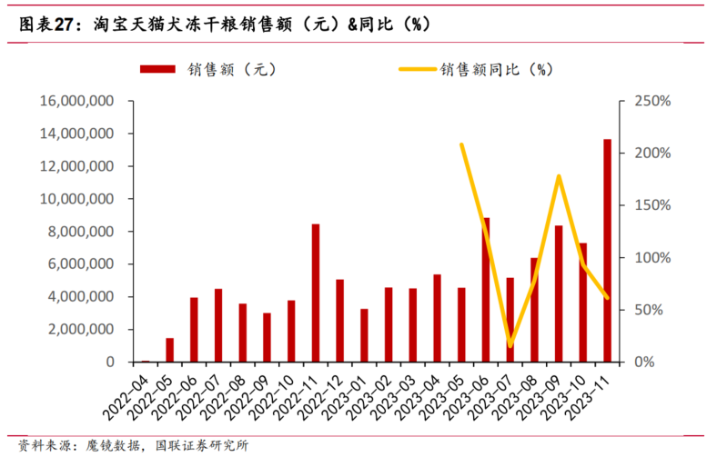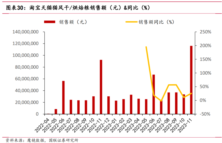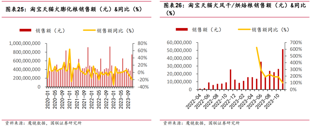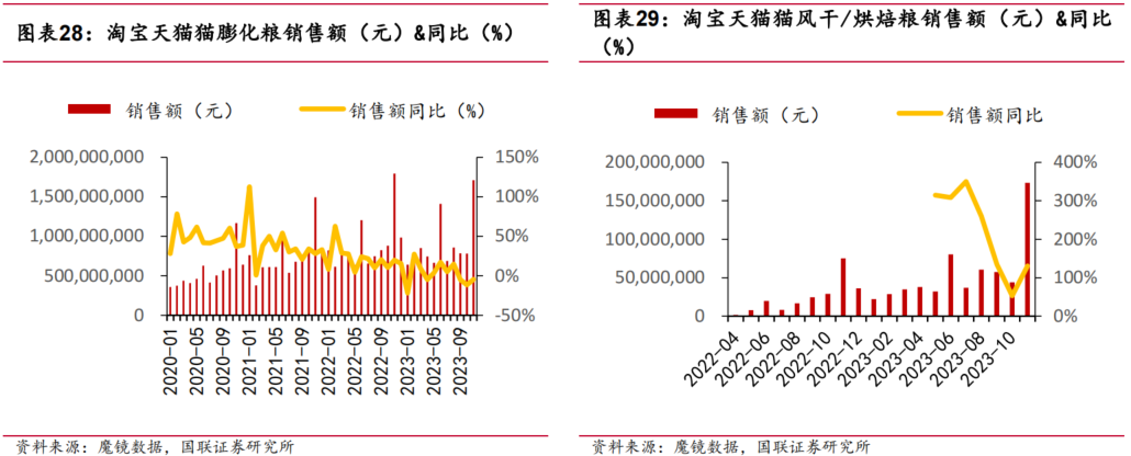 2023年12月份,淘寶天貓犬膨化糧、風(fēng)干/烘焙糧、凍干糧銷售額分別為3.77/0.17/0.06億元,同比-23.65%/+32.09%/+14.91%,銷量同比-8.10%/+125.87%/+79.58%。