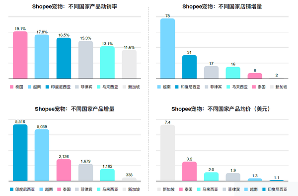 Shopee平臺(tái)越南寵物產(chǎn)品市場(chǎng)份額在東南亞六國(guó)中排名第五,占東南亞市場(chǎng)總銷售額的19%。產(chǎn)品動(dòng)銷率?、寵物產(chǎn)品新增量?與寵物店鋪新增多是越南寵物市場(chǎng)的三?亮點(diǎn)。