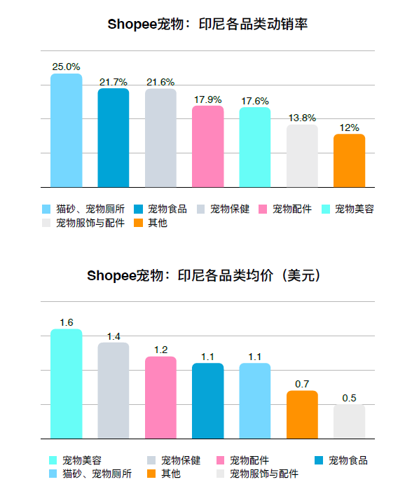 Shopee東南亞六國(guó)中,印尼寵物產(chǎn)品市場(chǎng)份額與泰國(guó)均為第?,均占東南亞市場(chǎng)總銷售額的25%,發(fā)展前景可觀。寵物清理、保健產(chǎn)品動(dòng)銷率?、寵物保健產(chǎn)品店鋪增量?、產(chǎn)品均價(jià)低是印尼寵物市場(chǎng)的三?亮點(diǎn)。
