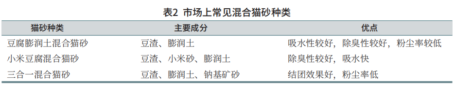 近年來市場上出現(xiàn)一些混合貓砂(表2),比較常見的混合貓砂主要是將膨潤土貓砂和豆腐貓砂混合。豆腐貓砂原料安全,吸水性較好,抑菌除臭性較好,膨潤土貓砂價格低廉,抑菌除臭性較差。可綜合豆腐貓砂和膨潤土貓砂各自的優(yōu)缺點,在此基礎(chǔ)上通過試驗,篩選相對合適的配比工藝,研制功效性更好的貓砂。王誠等通過研究得出當(dāng)豆腐貓砂與膨潤土貓砂的混合比例為7∶3時,在吸水性、結(jié)團性、粉塵率和除臭性能上有良好的表現(xiàn)。