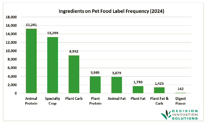 寵物食品標簽上列出的成分中,動物蛋白(15,241種)的頻率最高,其次是特種作物成分(13,299種)和植物碳水化合物成分(8,952種)。上述分類體系通過逆向解析寵物食品標簽建立,其中動物蛋白類原料在標簽成分表中出現(xiàn)頻次最高,反映出寵物食品行業(yè)對優(yōu)質(zhì)蛋白來源的重視。