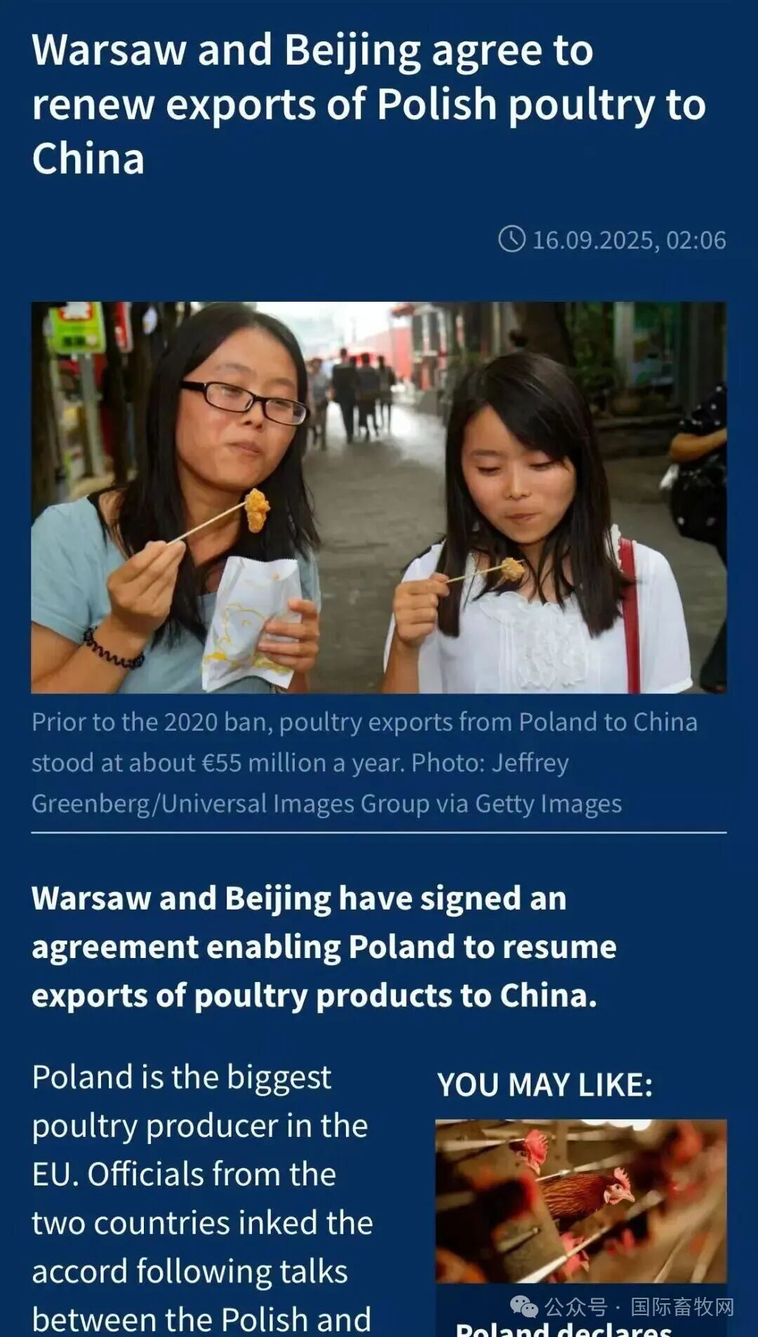 據(jù)悉,中國都因2020年和2024年9月波蘭暴發(fā)高致病性禽流感疫情而暫停相關(guān)進口。自2014年以來,波蘭一直是歐盟最大禽肉生產(chǎn)國,占?xì)W盟禽肉產(chǎn)量的20%以上 。
