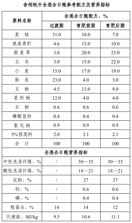 第三階段(進(jìn)場91天—出欄,育肥后期):此階段為期約3個月,是脂肪沉積和肉品質(zhì)形成的關(guān)鍵時期。通過進(jìn)一步提高日糧能量水平,顯著增加胴體重,改善脂肪沉積和牛肉品質(zhì),以達(dá)到最佳出欄標(biāo)準(zhǔn)。以干物質(zhì)計,日糧精粗比為65:35,代謝能11.1兆焦/千克,粗蛋白含量為12%。