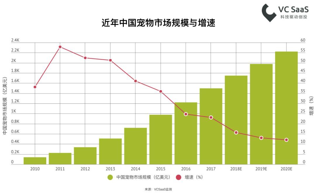 中國寵物市場經(jīng)濟(jì)總規(guī)模從2010年開始至今已經(jīng)出現(xiàn)了跨越式的增長,但增速已沒有5年之前明顯,預(yù)計(jì)到2020年總提市場規(guī)模將會(huì)突破2200億美元。
