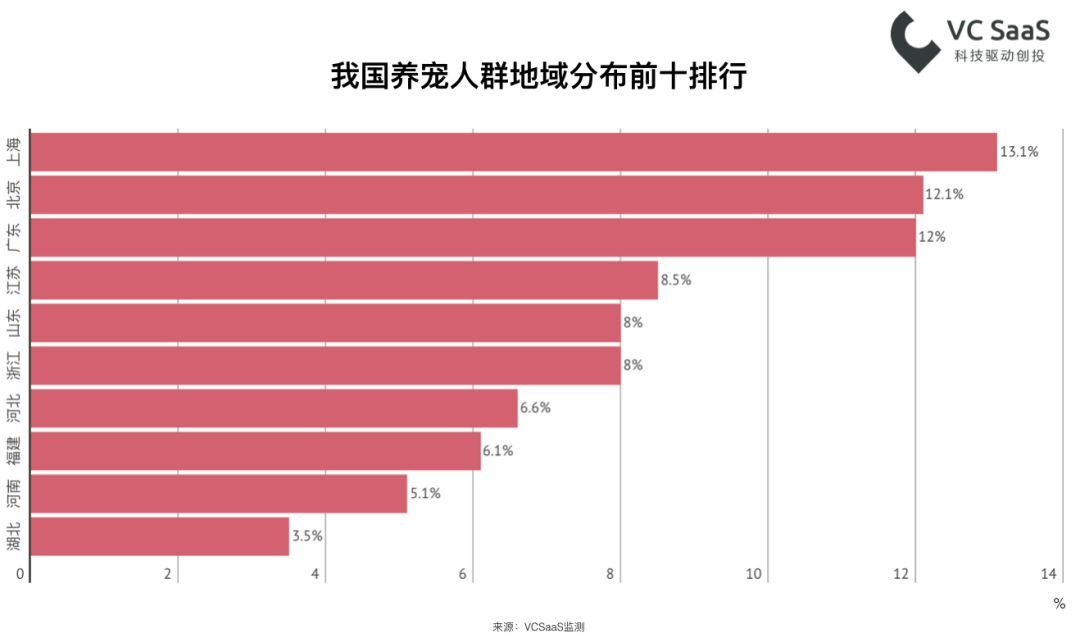 可以看出國內(nèi)城鎮(zhèn)化最高的城市養(yǎng)寵人群占比最高,且與地域文化有著密不可分的關(guān)聯(lián)。一般來說,對外開放程度高且中產(chǎn)及以上階層人群較多的地域養(yǎng)寵比例最高。比方說沿海地區(qū)的上海、廣東、江蘇等地。